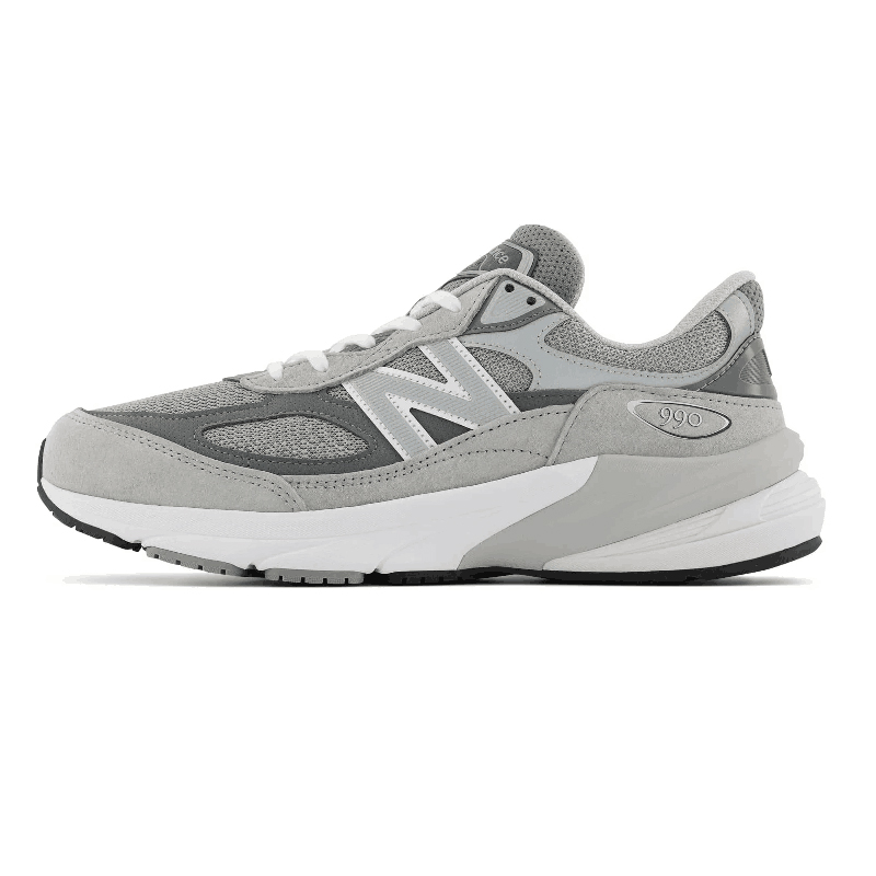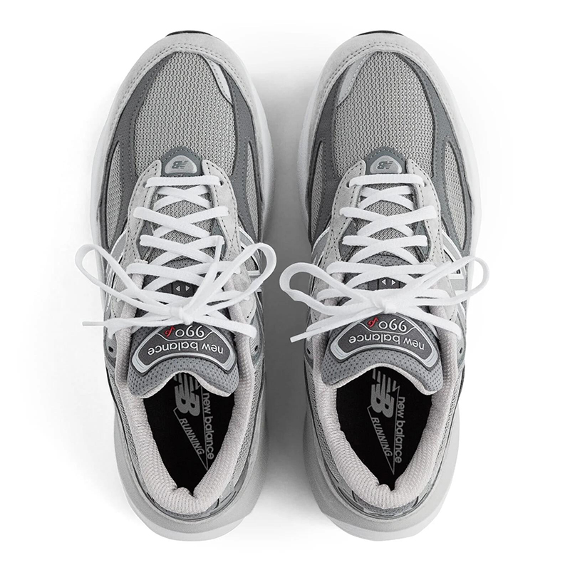 更新された990v6のデザインでは、従来のミッドフットサドル(足の甲を横断するパーツ)が不要になり、ピッグスキンスエードとシンセティックレザーのオーバーレイが、メッシュアッパーの上をかかとからつま先まで流れるように配されています。