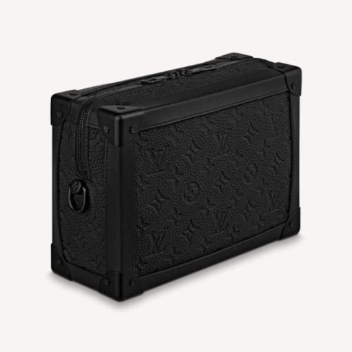 - ブラックのトリヨンレザーにトーン・オン・トーンでモノグラム・パターンをエンボス加工した「ソフトトランク」。マットなブラックのファスナーとストラップをあしらい、伝統的なメッセンジャーバッグに新鮮なひねりを加えました。