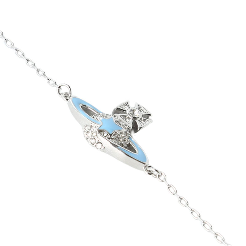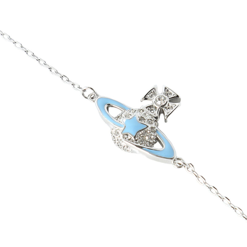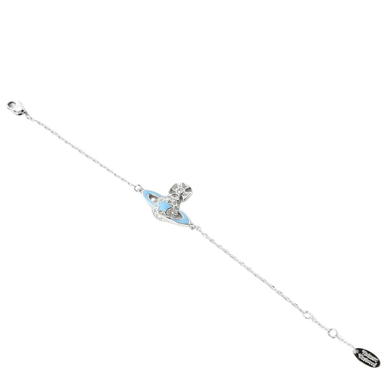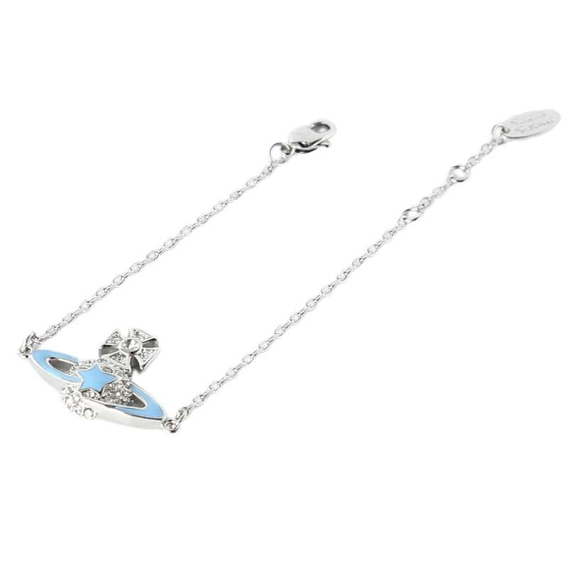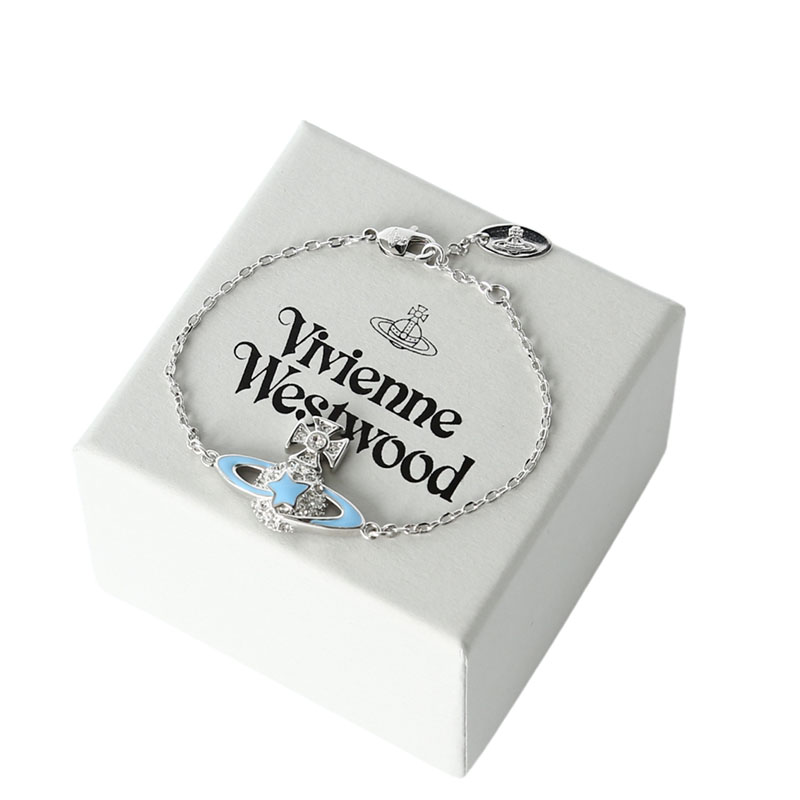 Vivienne Westwood ライトブルー オーブブレスレット正規品!希少・海外限定品✨英国パンクファッションの象徴「Vivienne Westwood」のアイコン、オーブ(土星)モチーフを可愛らしくデザインしたブレスレットです。デザイン:シルバーフレームにライトブルーのエナメルと輝くクリスタルをあしらい、清潔感のある爽やかな印象を演出。トップの十字架にはクリスタルを配し、ブランドの個性的なロマンティシズムを表現しています。素材:高品質なメタル素材を使用し、肌触りが良く長く愛用できる耐久性を備えています。付属品:専用ギフトボックス、ショッパー、クロスが付属し、プレゼントにも最適です。使いやすさ:調節可能なチェーンで、手首のサイズに合わせてフィットさせることができます。日常使いから特別な日のコーデまで、どんなスタイルにも洗練されたアクセントを加える一足。海外限定のレアデザインで、自分へのご褒美や大切な人への贈り物にぴったりです。